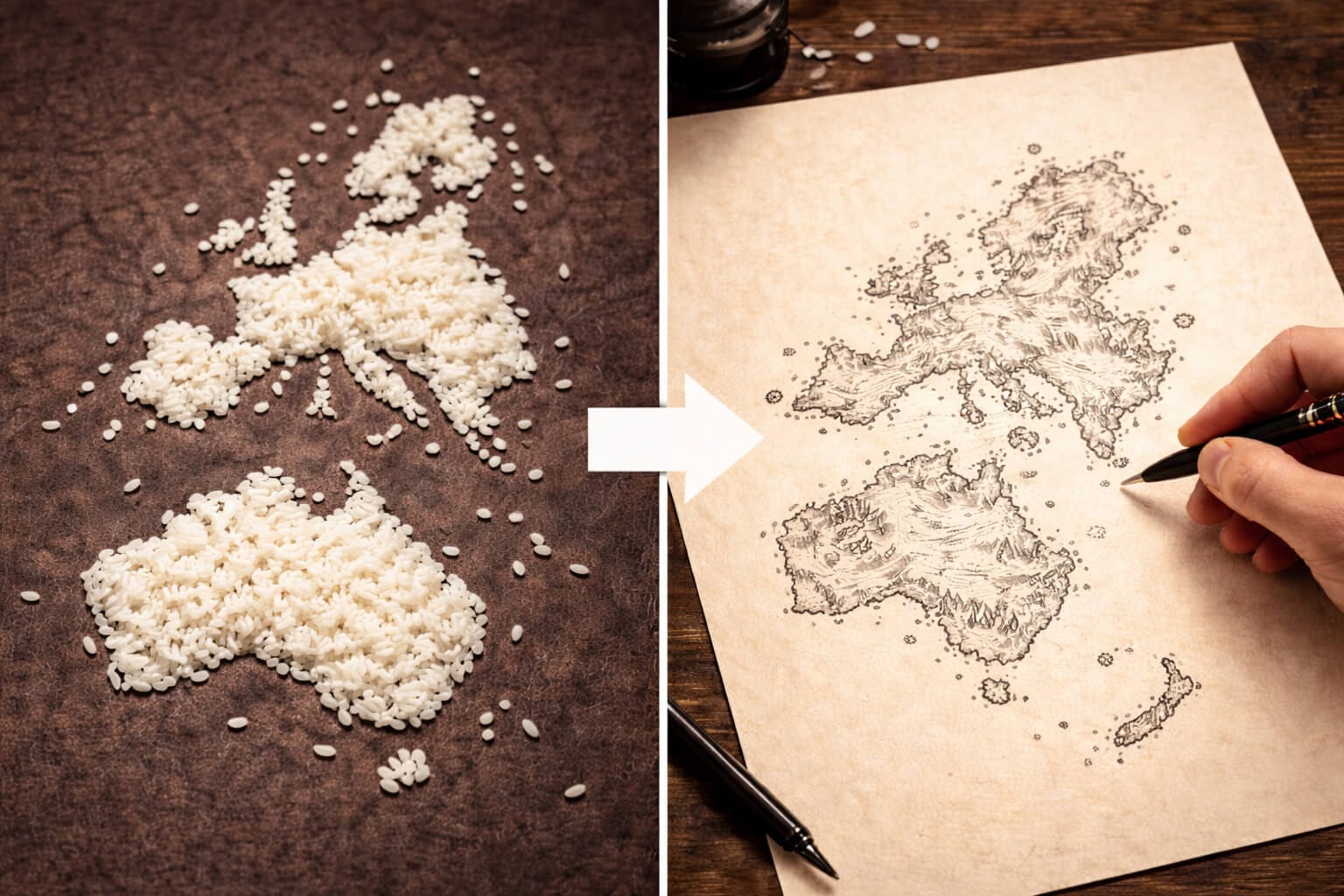 Rýže funguje úplně jinak než tekutiny. Neslévá se, ale hromadí, rozpadá a vytváří přirozené shluky. Když ji rozsypeš na tmavší papír nebo desku, rychle se ukáže, kde by mohl vzniknout kontinent, kde poloostrov a kde jen osamělý ostrůvek. Okraje jsou roztřepené, nepravidelné a „nedokonalé“.
